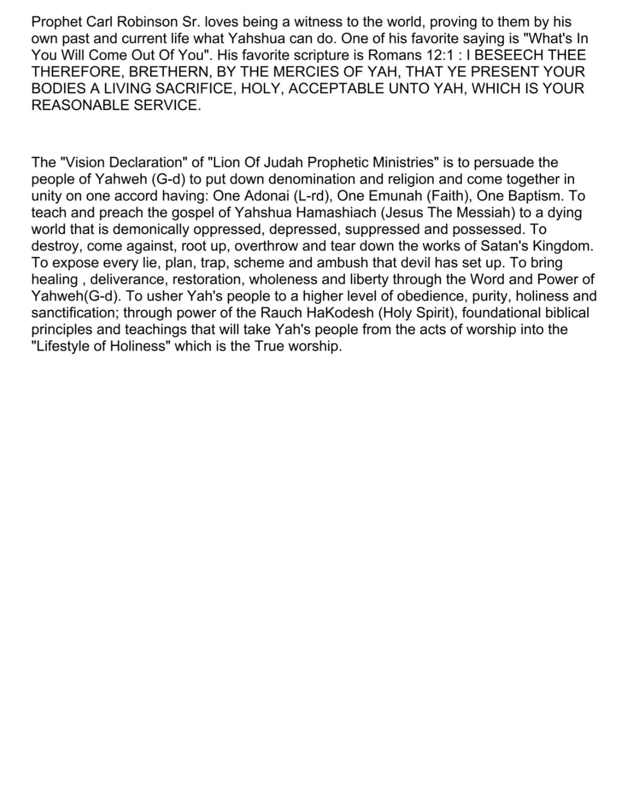 I am Pastor Prophet Carl Robinson Sr., The Pastor of the Lion of Judah Prophetic Ministries of Baltimore Maryland.